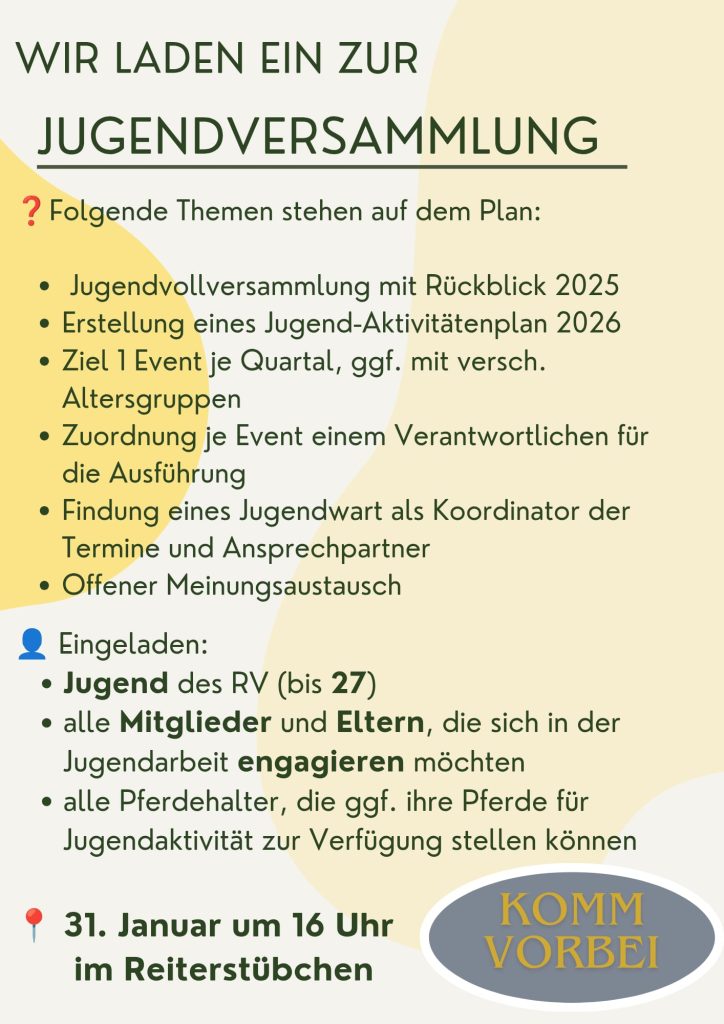 Alle Mitglieder des RVH sind herzlich eingeladen am Freitag 16.Januar ab 18 Uhr im Reiterstübchen mitzuwirken, wie der Reiterverein sich künftig aufstellen könnte…. Was läuft gut? Was muss ich ändern? Wo stehen wir finanziell? Wo stehen wir sportlich? – Wie könnte die neue Organisation aussehen. Begleitet wird dieser Austausch von Herrn Rüdiger Hochscheidt von der AG Sport Bruchsal – der den Verlauf moderiert und uns bei der Zukunftsausrichtung unterstützen möchte.